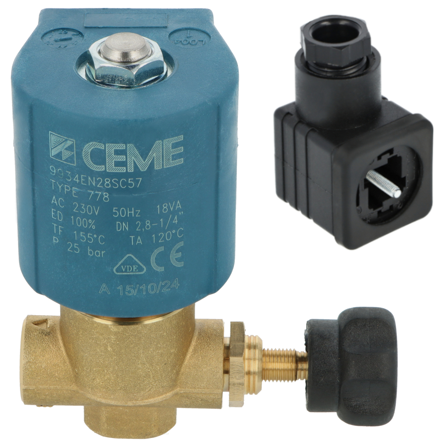 Elektrozawór kątowy CEME 2.8 – 1/4" to wysokiej jakości zawór elektromagnetyczny normalnie zamknięty (NC) z ręczną regulacją przepływu, przeznaczony do wytwornic pary. Zapewnia precyzyjne sterowanie przepływem czynnika oraz niezawodną pracę w wysokich temperaturach.