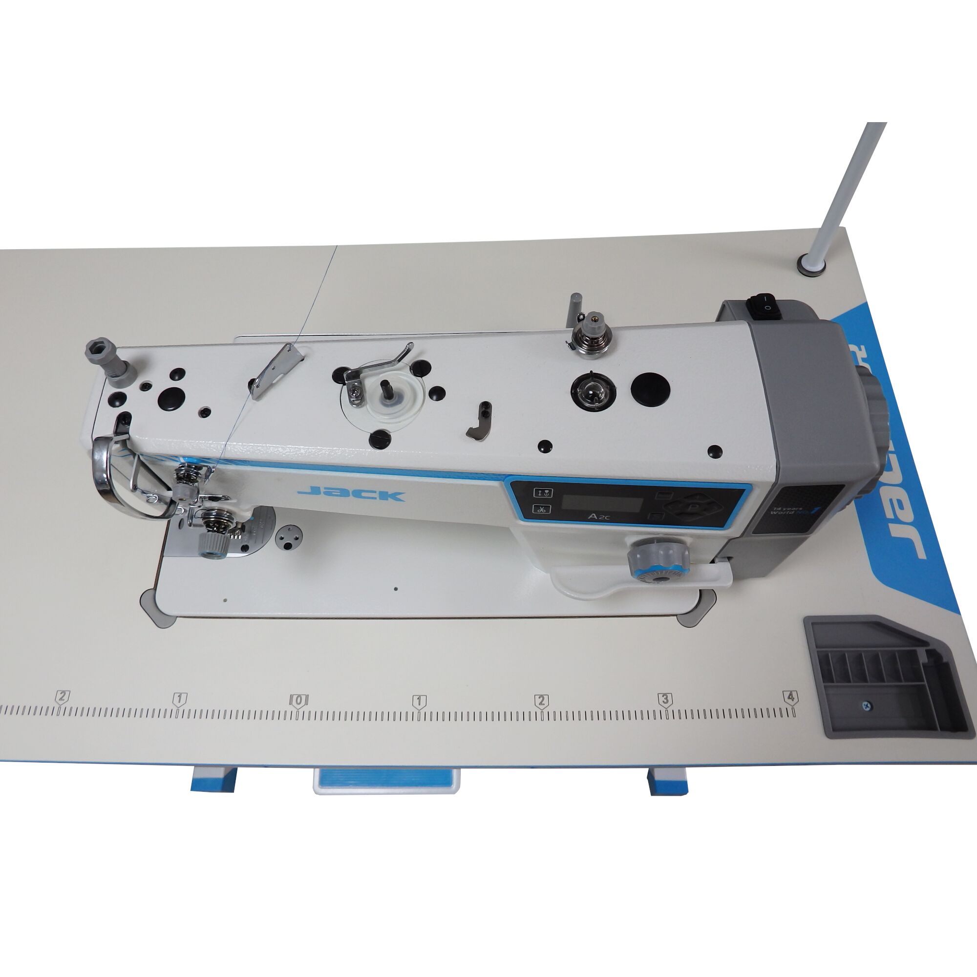 Stebnówka JACK A2B posiada zamontowany panel operacyjny w korpusie. Dodatkowo producent wyposażył maszynę w oświetlenie LED przy igielnicy z możliwością 3-stopniowej regulacji natężenia światła, co w znaczny sposób poprawia komfort pracy na stebnówce.