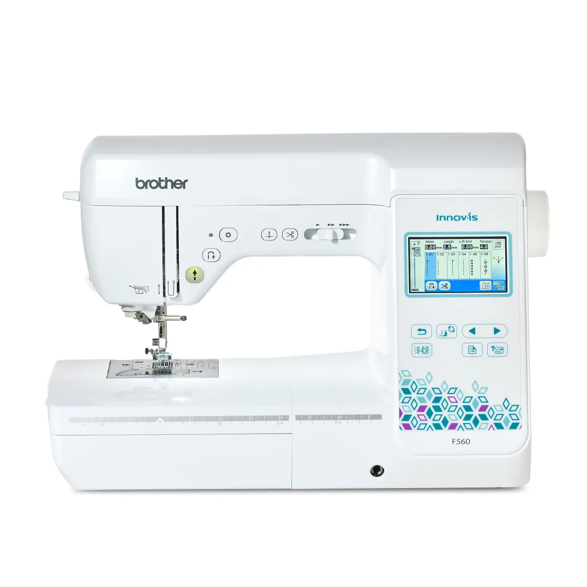 Komputerowa maszyna do szycia Brother F560 posiada dotykowy ekran, który zapewnia wygodną edycję – ściegi można obracać, łączyć i powielać, tworząc bardziej rozbudowane kompozycje. Model F560 został wyposażony w zaawansowany system transportu SFDS, w którym materiał prowadzony jest po obrysie prostokąta z równomierną prędkością i stałym dociskiem. Dzięki temu nawet podczas szycia kilku warstw tkaniny ścieg pozostaje równy, bez przepuszczania i zmiany długości.