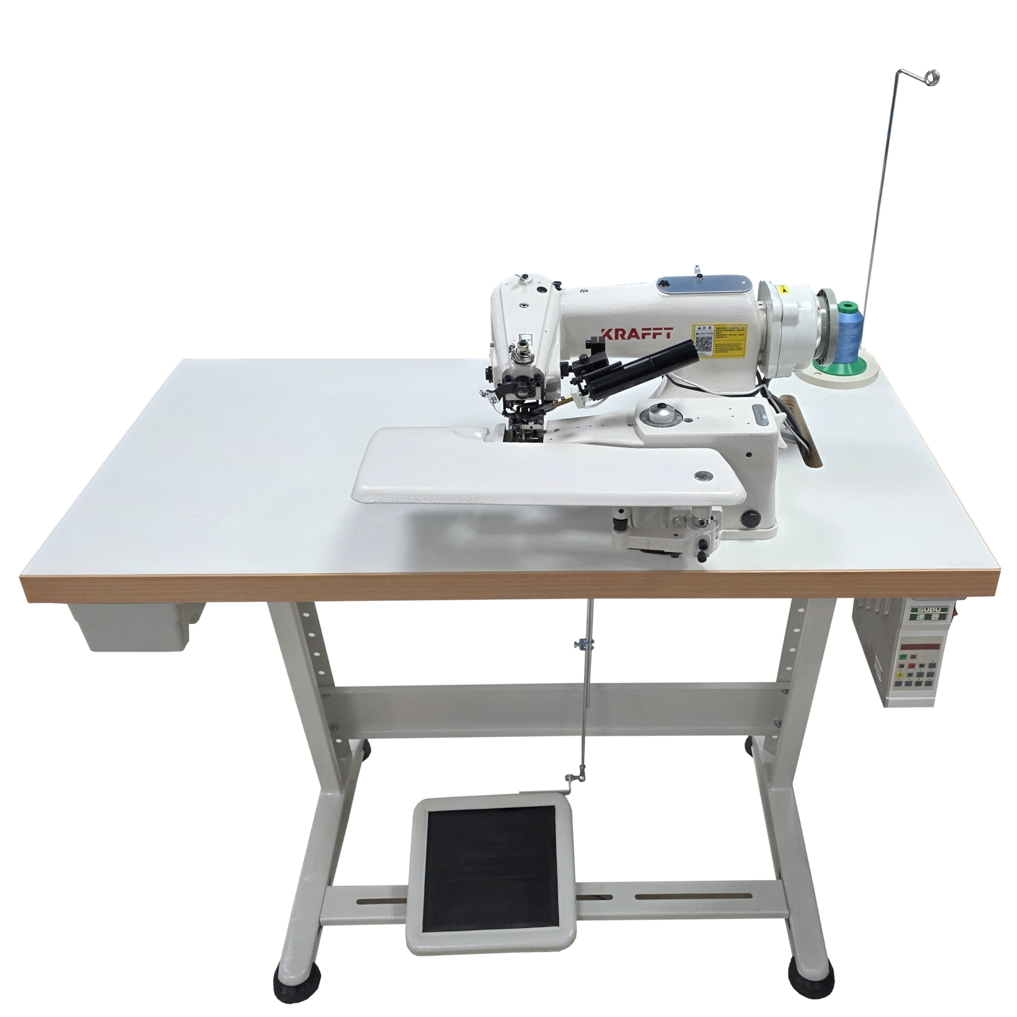 Podszywarka KRAFFT KF-101D-D3 została wyposażona w pneumatyczne sterowane automatyczne obcinanie nici oraz system pozycjonowania igły, które przyspieszają pracę, podnoszą precyzję szycia i minimalizują ryzyko błędów.